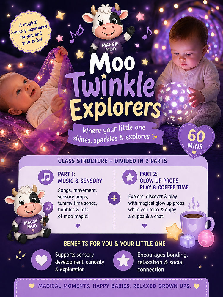 These classes are SENSORY based classes which include MUSIC & MOVEMENT- lots of jumping, shaking, stomping. Sensory props to enhance child growth & development. We use fast & slow songs, add some dress up and a range of various props including shakers, ribbons, feathers, scarves, puppets, and a whole load more. We play games like peek a boo & musical statues.